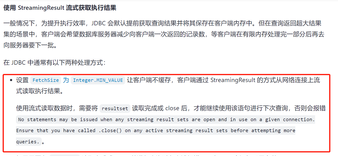 我理解流式查询应该是一部分一部分去查询的,应该和普通查询一下子都查出来 不一样吧?