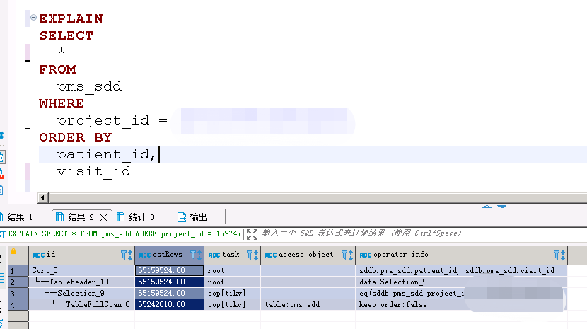 我觉得也是,就是因为这个排序,把所有数据都加载到了tidb server 中导致了单条查询大于1G。我尝试着加了patientid 和 visitid的索引就可以了