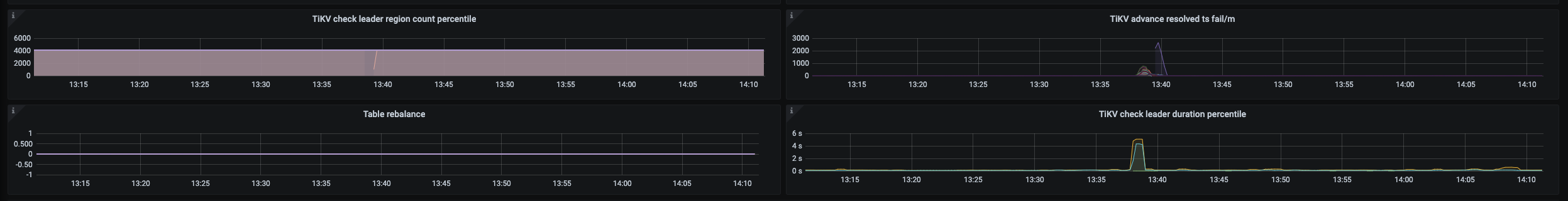 正在测试v6.5版本的ticdc同机房同步到下游mysql,基本都是秒内,但是13:39左右会有延迟问题到40S左右,是不是NotLeader