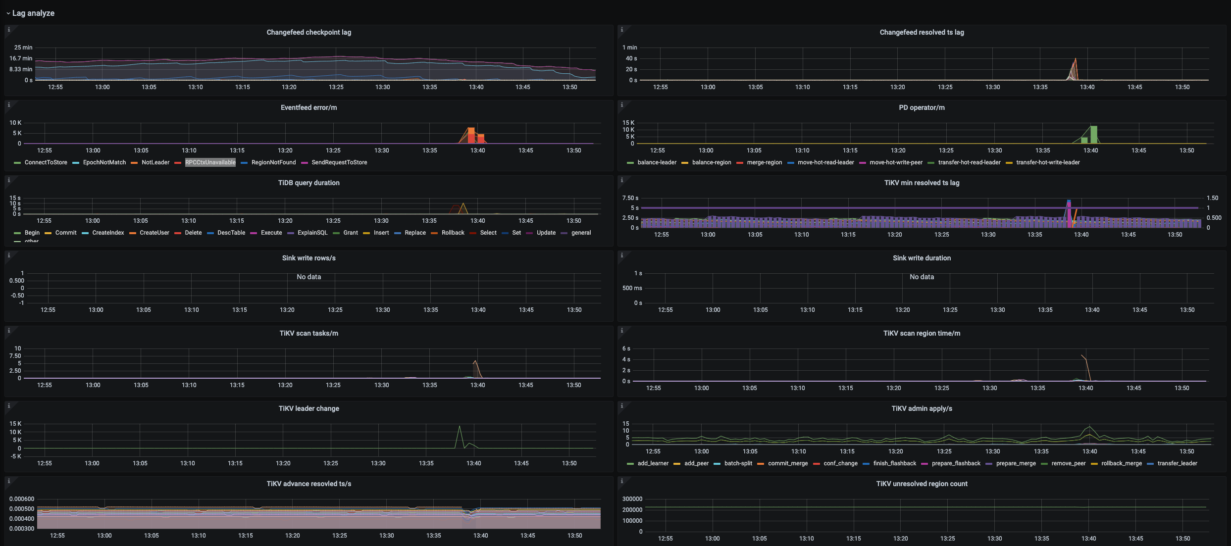 看时间和上游 tikv leader 有大量切换相关,第一个监控 sink write row 为啥没数据?