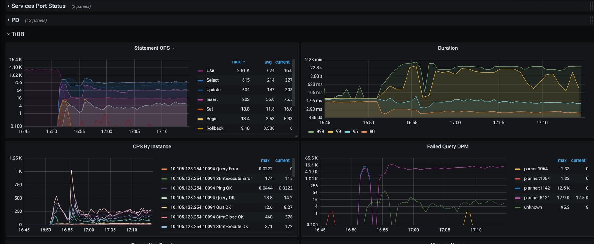 通过tidb-dashboard面板,打开topsql,你就能看到哪些SQL消耗CPU多了。另外你最好再介绍一下集群细节,只看监控16:50开始update和insert的语句开始变多了,duration也开始增加,tikv负载开始增高。