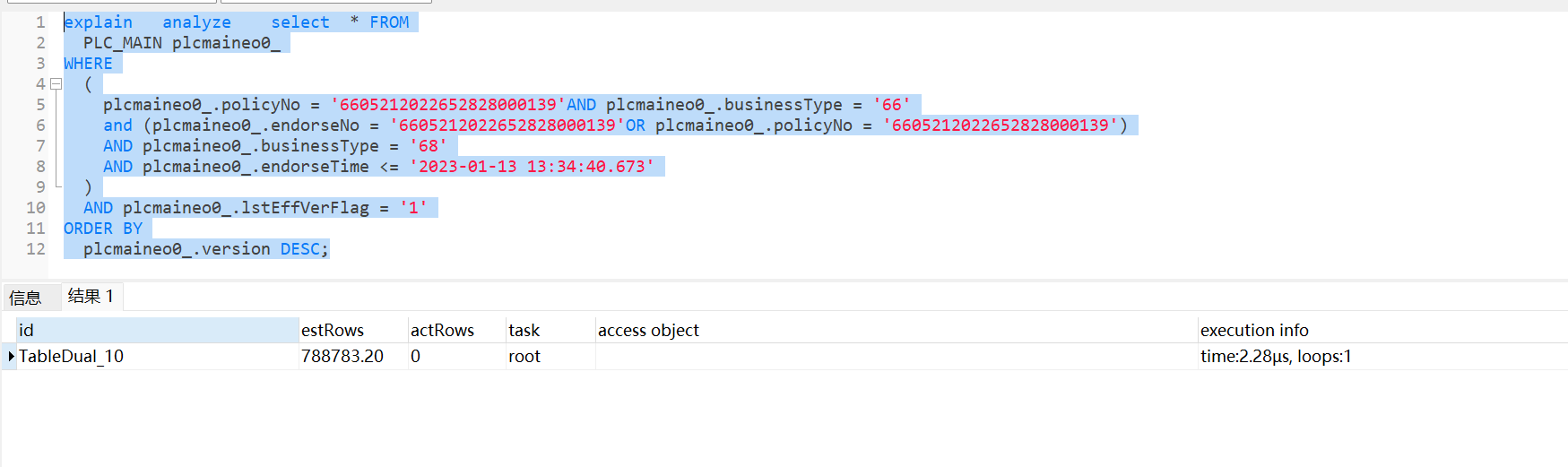 plcmaineo0_.policyNo = '6605212022652828000139’AND plcmaineo0_.businessType = ‘66’