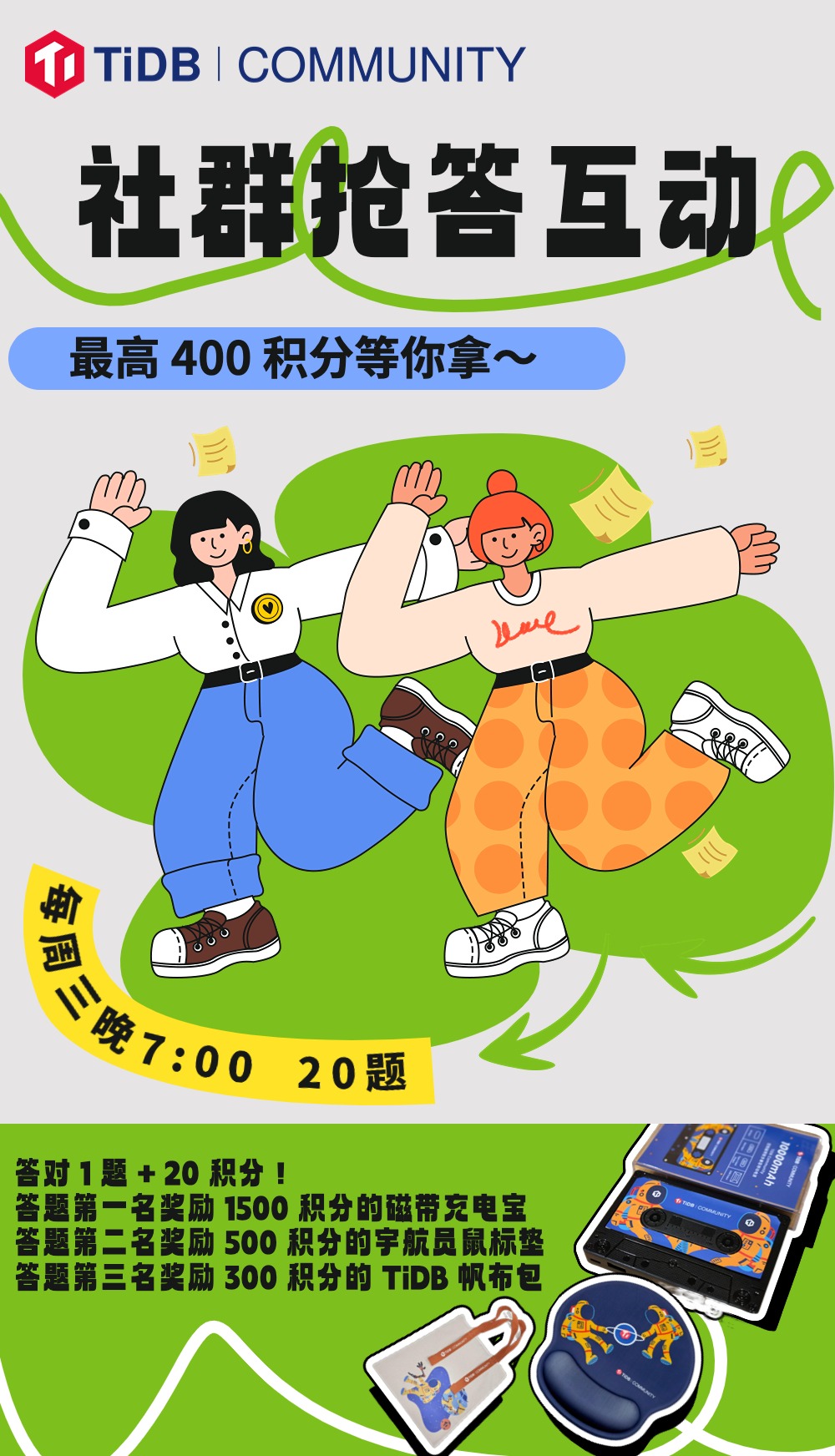 【社群抢答互动】是 每周三 晚上 7:00 在 TiDB 交流群以答题互动的方式,活跃社群,科普更多社区& TiDB 相关信息的活动。每期活动有 20 题,答对一题加 20 社区积分~