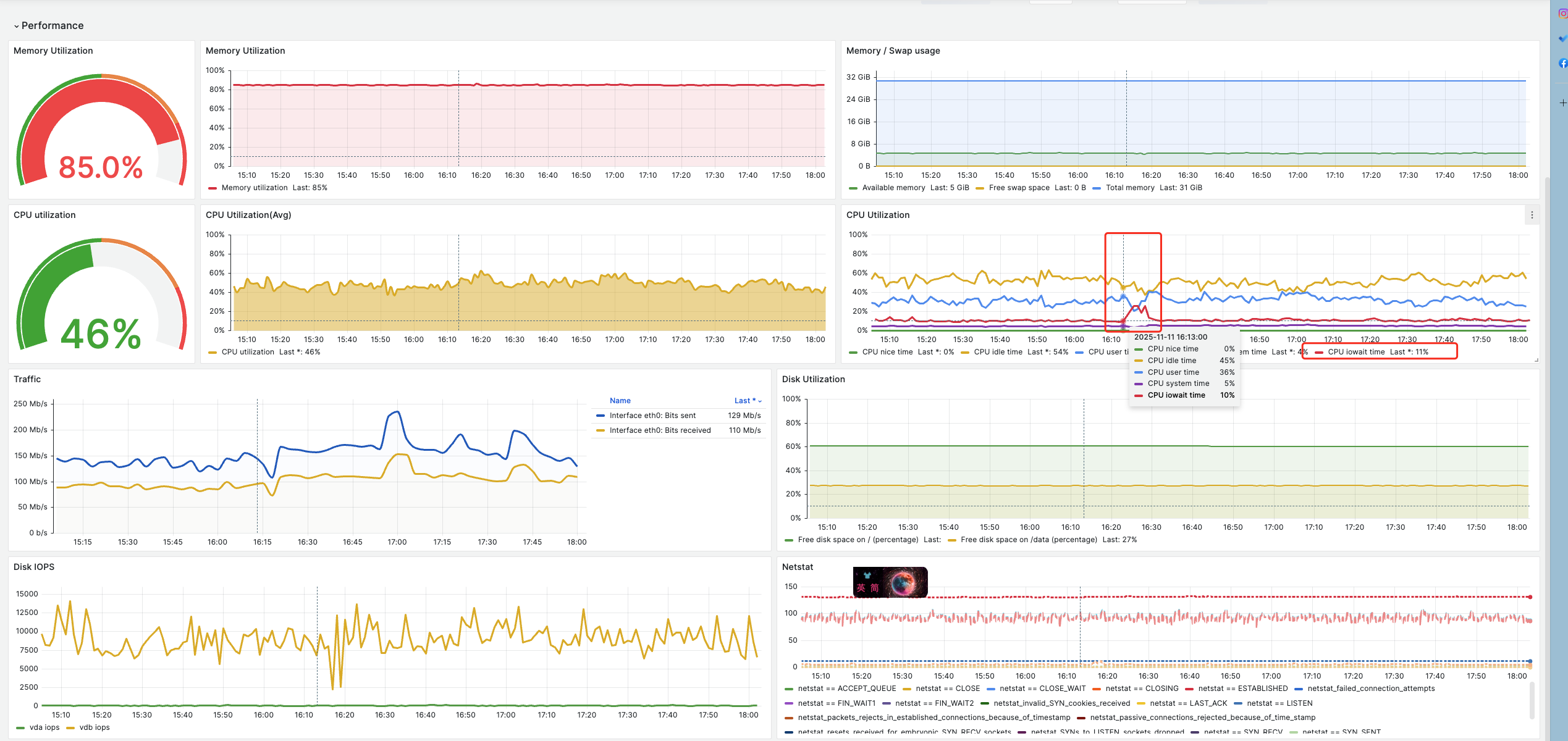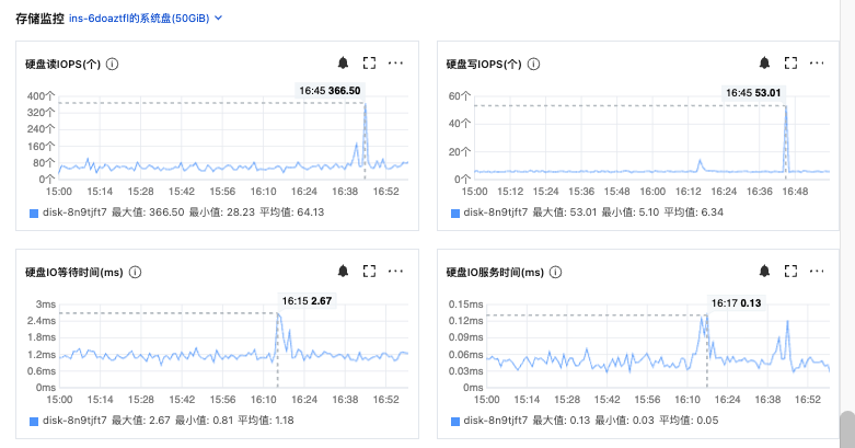 应该不是呢,网络带宽什么都不高。目前没有内网延迟和丢包的监控。这个不好说 问题应该还是磁盘IO的问题 从云主机监控看到那个点 磁盘IO等待很长