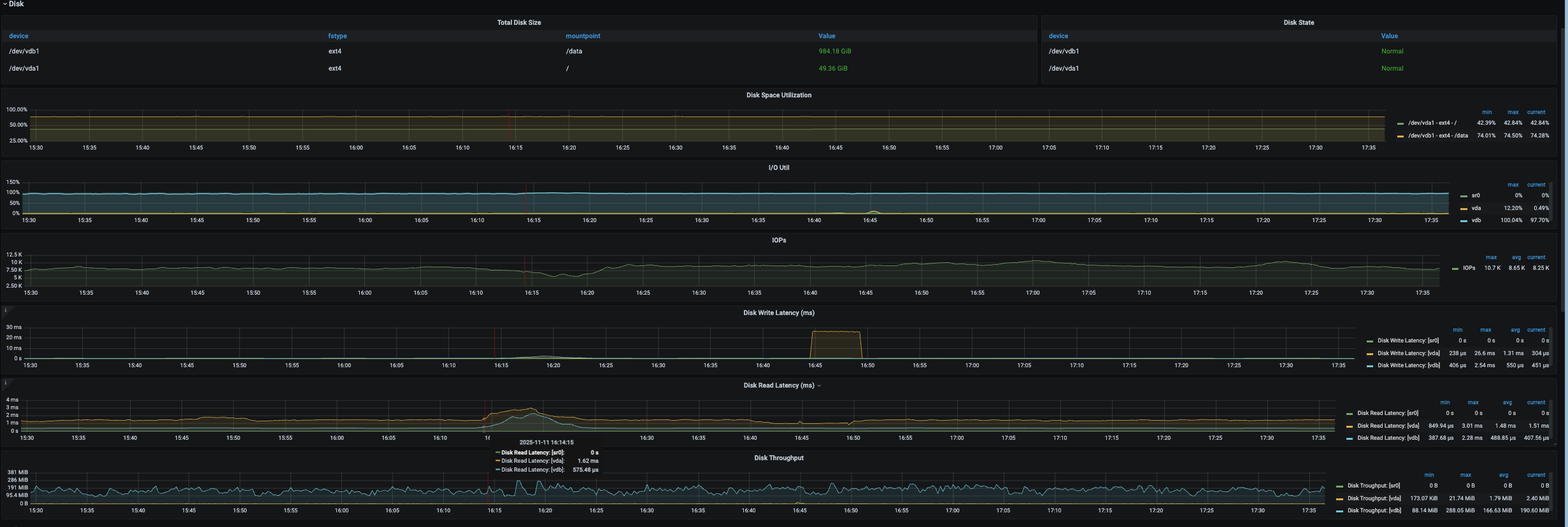 嗯,目前看到是这个节点的磁盘iowait有点高, 读延迟那会增大了很多