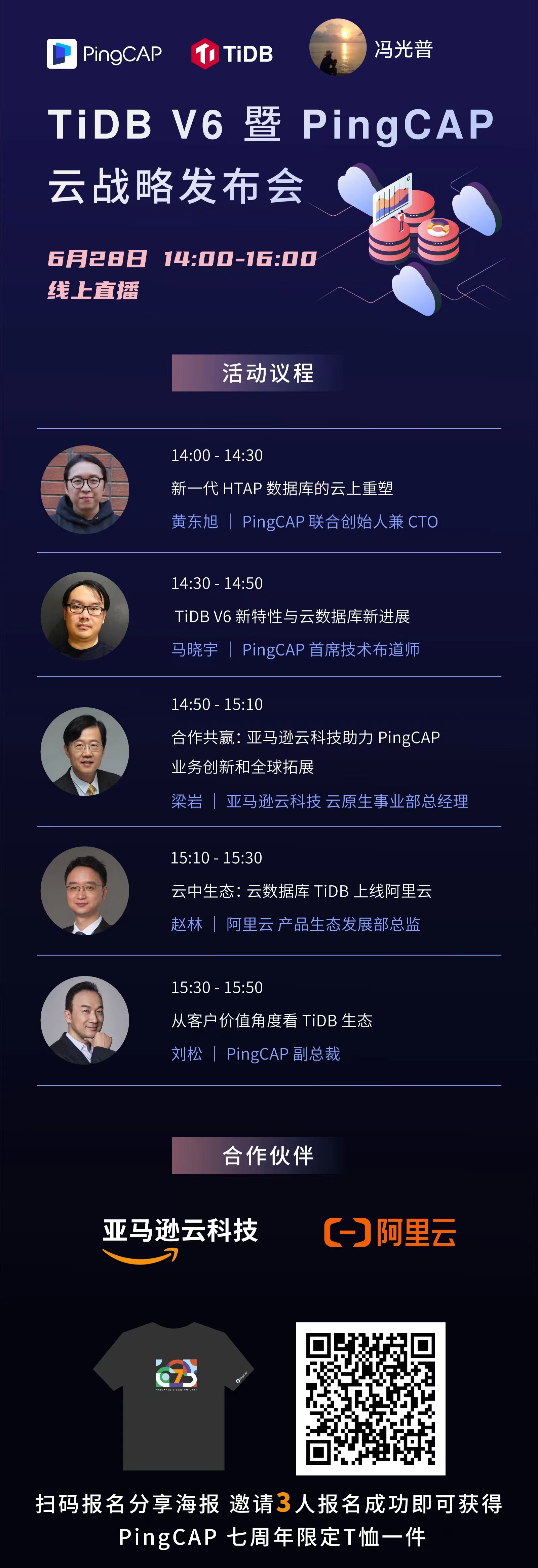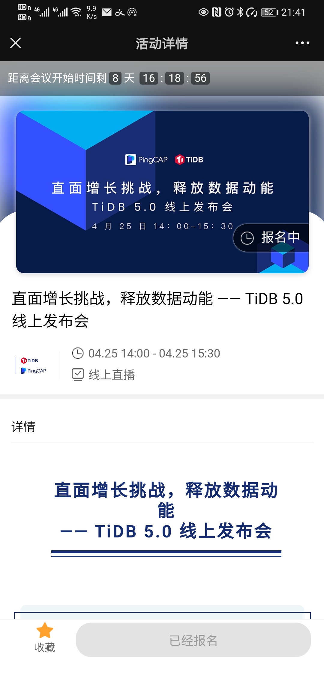 【已结束】TiDB 5.0 线上发布会报名即送100积分,100经验值!