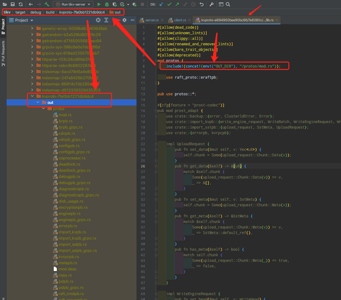引入的仓库,在lib.rs里面又指向了当前仓库的target文件夹,在这个文件夹里面有proto文件对应的rust源码